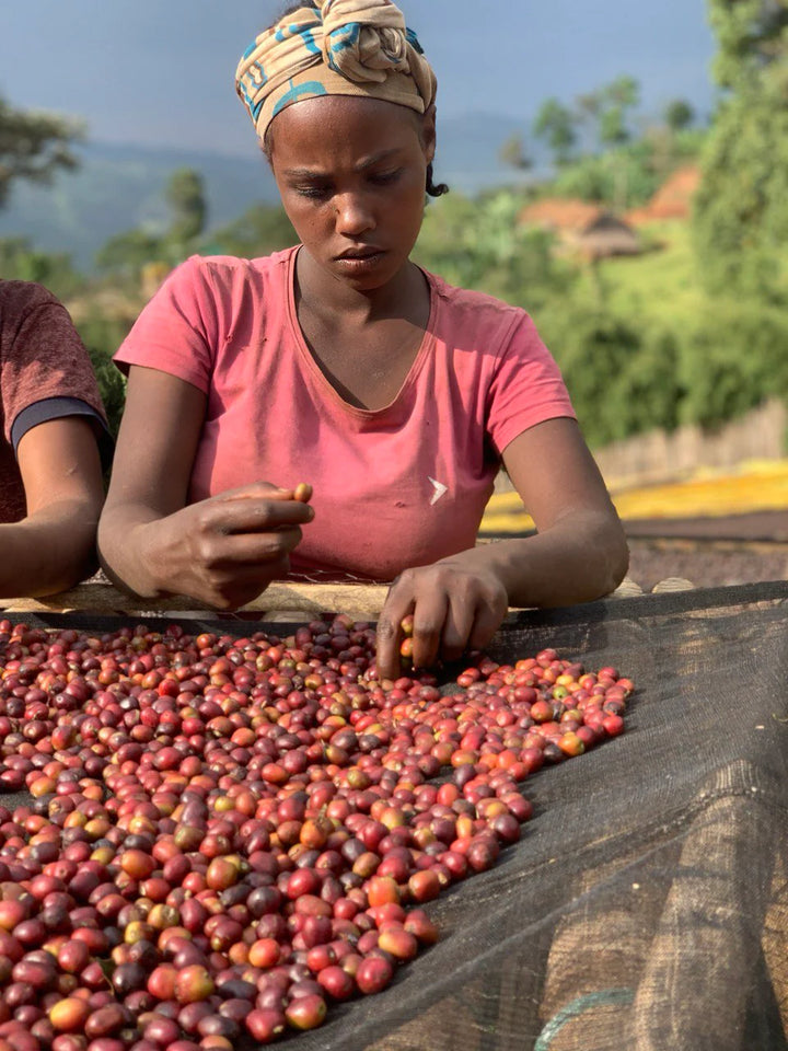 Quality and sustainability are key principles at this facility. Approximately 700,000 kilograms of red cherries are processed annually. The coffee varieties 74158, 74165, and 74110 originate from the Jimma Research Center, along with heirloom varieties. The station implements two processing methods: washed and natural.
